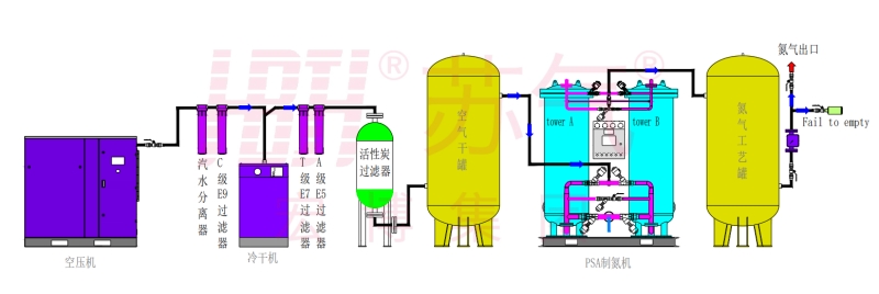 環(huán)境空氣經壓縮凈化,除去油、水、塵后,進入由兩個裝填有碳分子篩的吸附塔組成的變壓吸附裝置。壓縮空氣由下至上流經吸附 塔,其間氧分子在碳分子篩表面吸附,氮氣由吸附塔上端流出,進入粗氮緩沖罐,經過一段時間后,吸附塔中碳分子篩被吸附的氧飽和,需進行再生。再生是通過停止吸附步驟,降低吸附塔壓力來實現(xiàn)的。兩個吸附塔交替進行吸附和再生,從而確保氮氣的連續(xù)輸出。